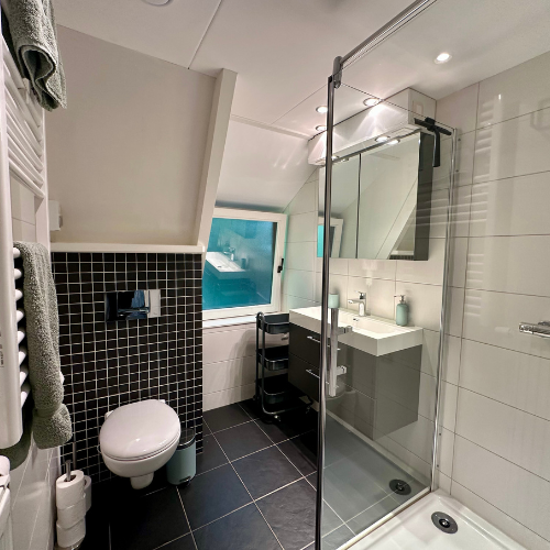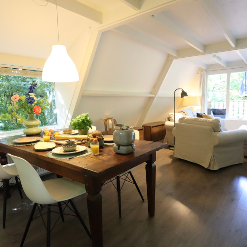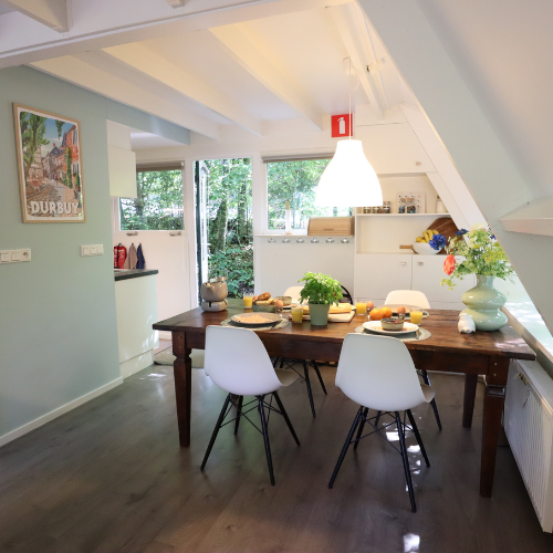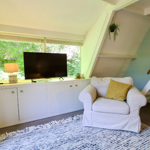In de woonkamer vind je een eettafel, een zithoek met een comfortabele bank, en een smart-tv met toegang tot o.a. Netflix. Ook liggen er leuke spelletjes klaar, zoals Hitster en 30 Seconds, voor gezellige avonden samen. WIFI is gratis aanwezig.