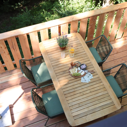 Op het ๐ฎ๐ฌ๐บ๐ฎ balkon is een comfortable tuinset, parasol en droogrek. In verband met brandgevaar in het bos mag je alleen BBQโn op de gezamenlijk BBQ plek op het park.