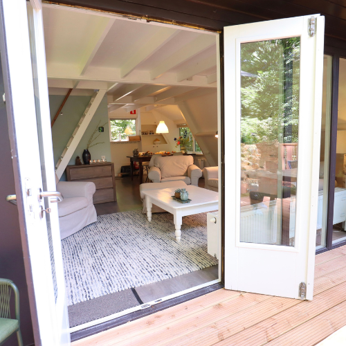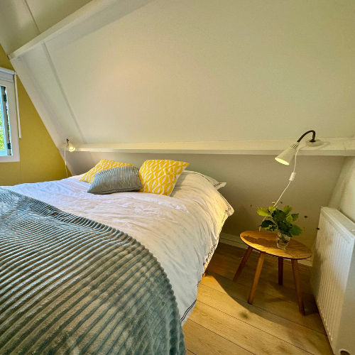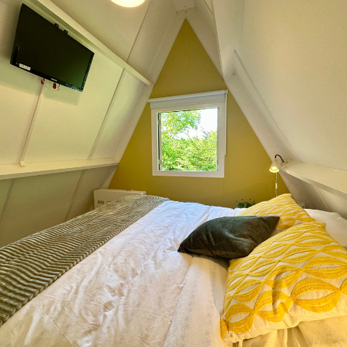 Via een ๐๐๐ฒ๐ถ๐น๐ฒ ๐๐ฟ๐ฎ๐ฝ bereik je de bovenverdieping. Er is een traphekje voor kinderen. Let op: ben je slecht ter been, dan is dit huisje mogelijk minder geschikt vanwege de trap.